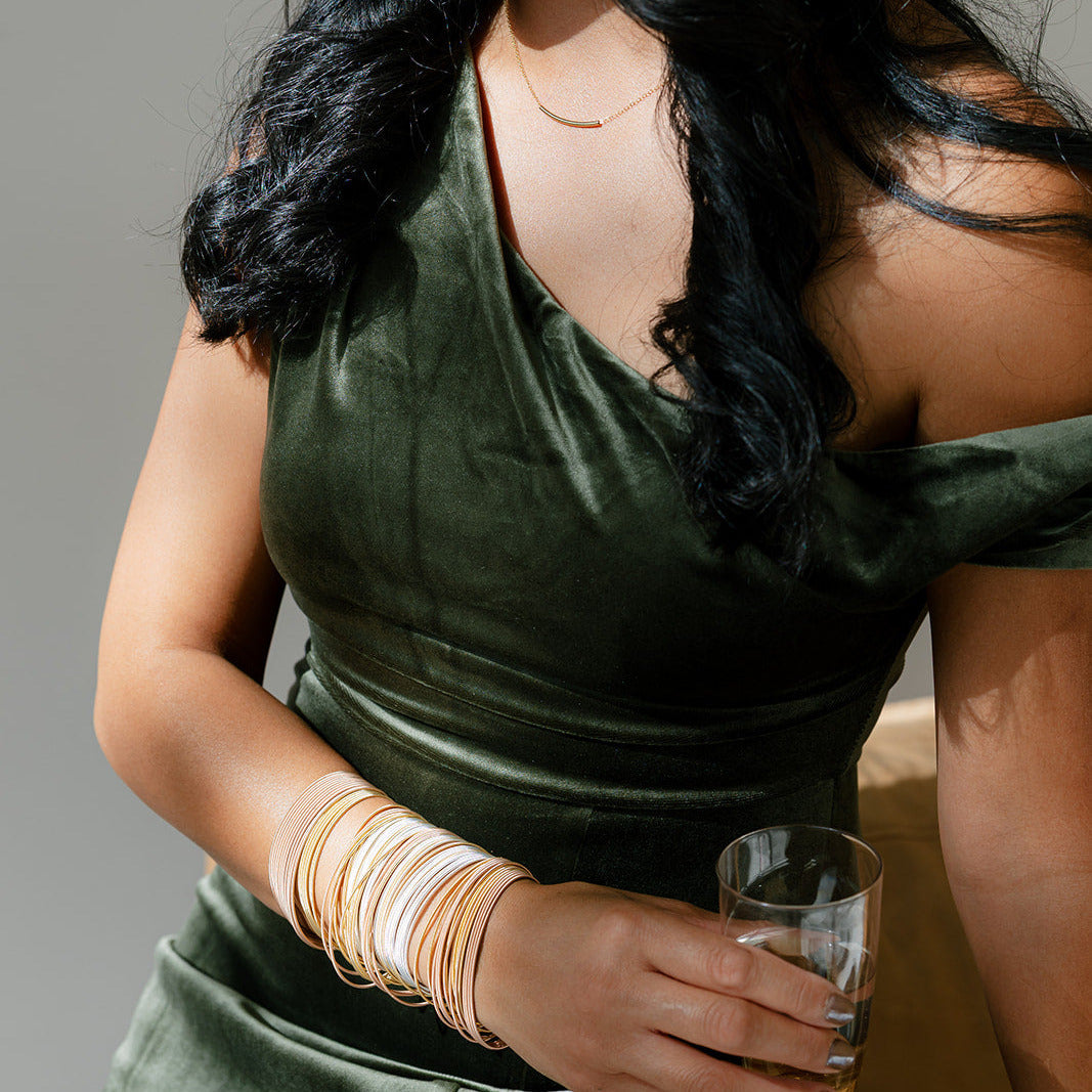 This necklace features a sleek gold tube on a fine chain—simple in form, but rich in presence. It’s the kind of piece you wear every day without thinking, yet never stop loving. Layer it or let it stand alone—either way, it speaks softly and says everything.